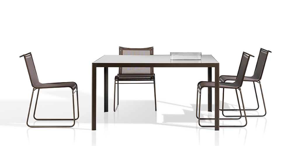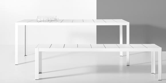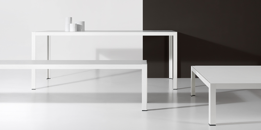 wide range of square and rectangular tables, benches and low tables with compact, wood or glass tops