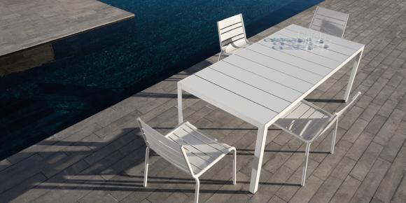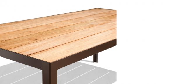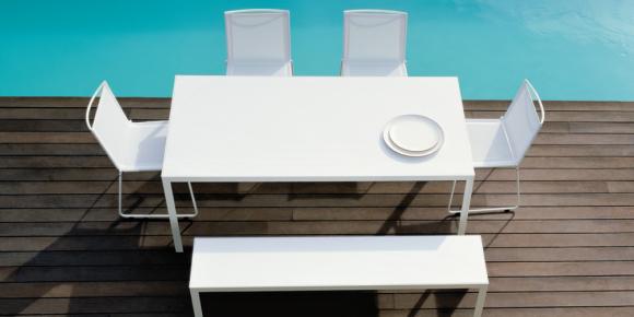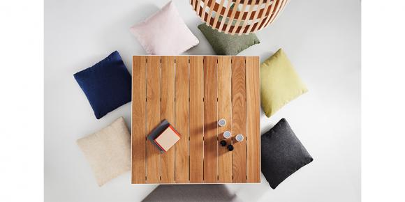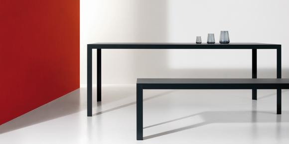 wide range of square and rectangular tables, benches and low tables with compact, wood or glass tops